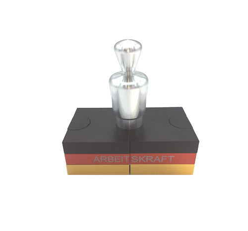 - Häppi aus Aluminium. Der Sockel ist schwarz, rot & gold eloxiert und sehr hochwertig gearbeitet. Die Beschriftung ist nicht aufgedruckt, sondern lasergraviert und somit gegen Abnutzung geschützt.